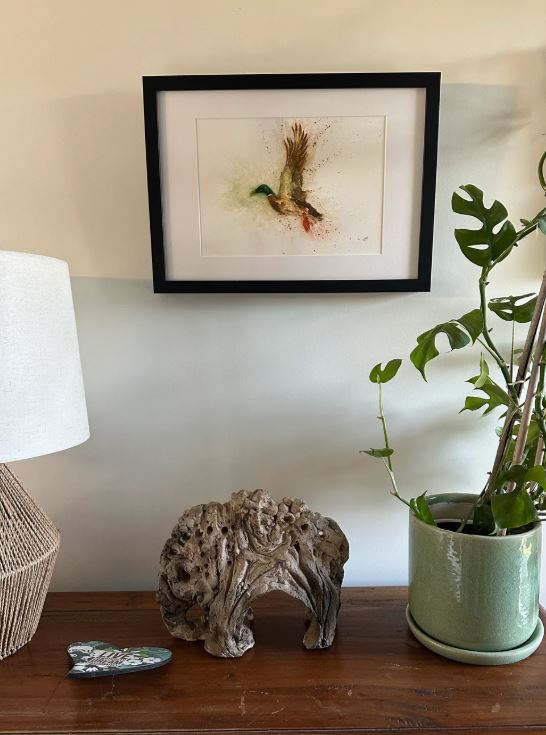 An A4 print of the "Flying Mallard" professionally framed in a black A3 frame with a cream mat border and ready to hang.